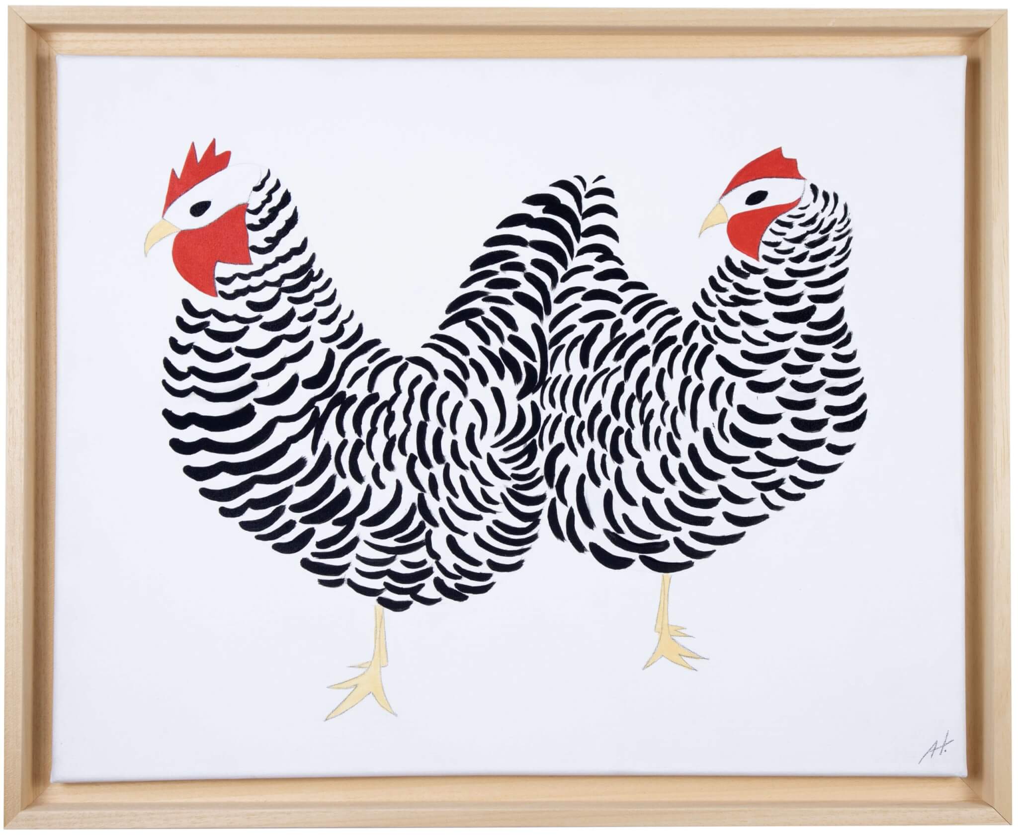 The painting emerged from black and white strokes I was playing with. Strokes became feathers and they formed 2 chickens.